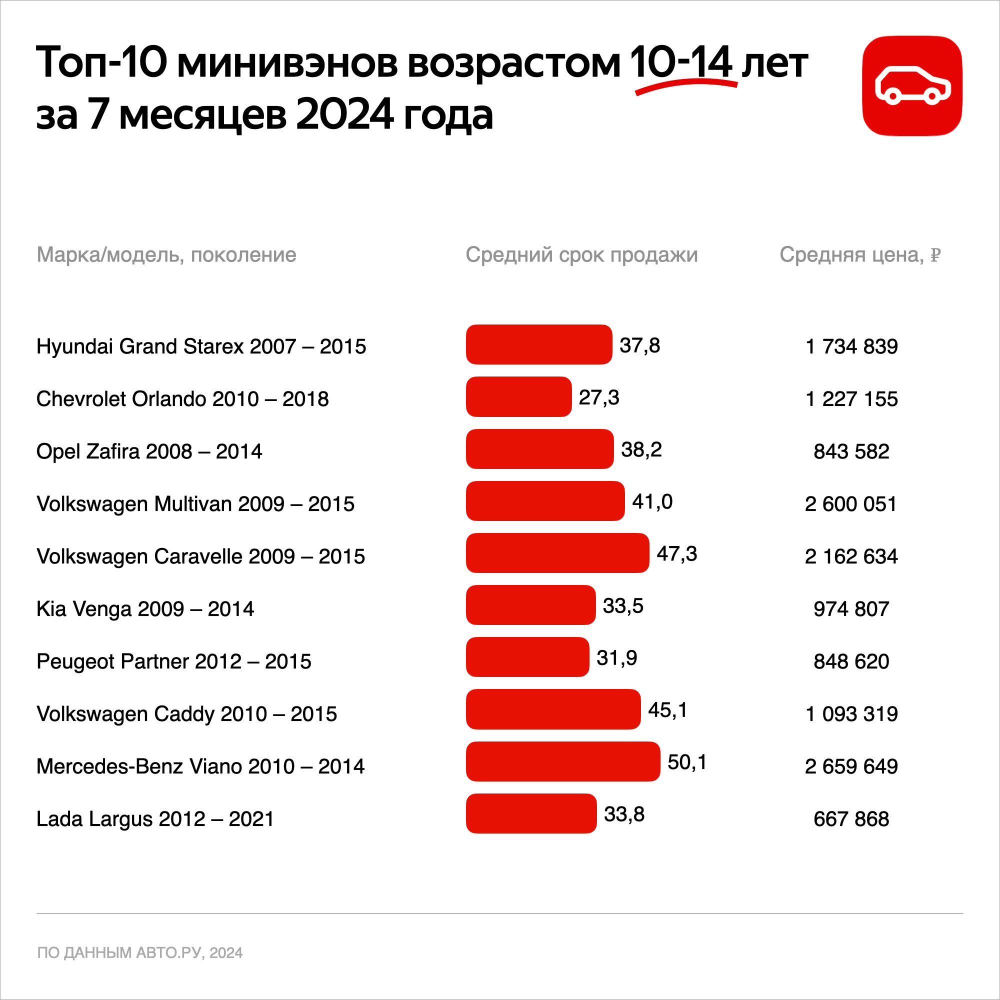 Итак, наибольший интерес вызывают у пользователей по итогам 7 месяцев 2024 года, вызывает корейский Hyundai Grand Starex. Его средняя стоимость составила 1,73 миллиона рублей. Следом идут Chevrolet Orlando (1,22 миллиона рублей) и Opel Zafira (843 тысячи рублей). Замыкают первую пятерку пара родственных моделей Volkswagen Multivan и Caravelle. Их средняя стоимость в этом году составляет 2,6 и 2,16 миллиона рублей соответственно. Единственная отечественная модель в первой десятке - Lada Largus. Ее в среднем предлагают за 667 тысяч рублей. Стоит напомнить, что это все авто со средним возрастом от 10 до 14 лет.